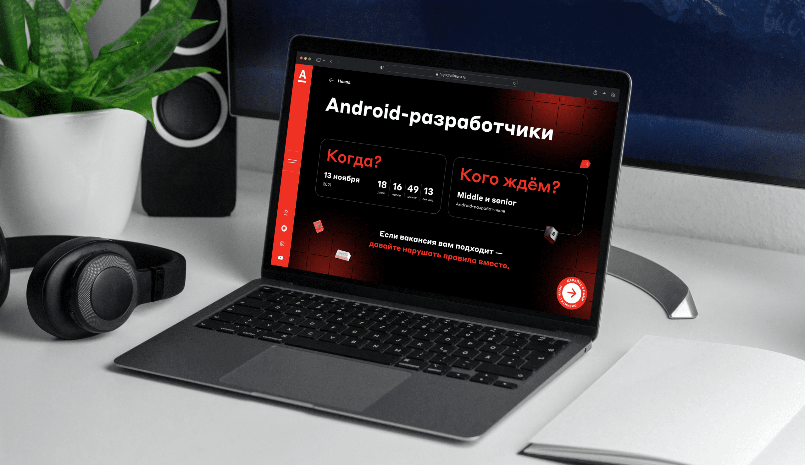 Мы предложили слоган “Нарушайте правила с Альфа-банком” и хэштег #Переходите на красный, чтобы продемонстрировать, что в Альфа-Банке можно идти против общепринятых правил: дресс-кода, принудительной работы в офисе и скучных задач.