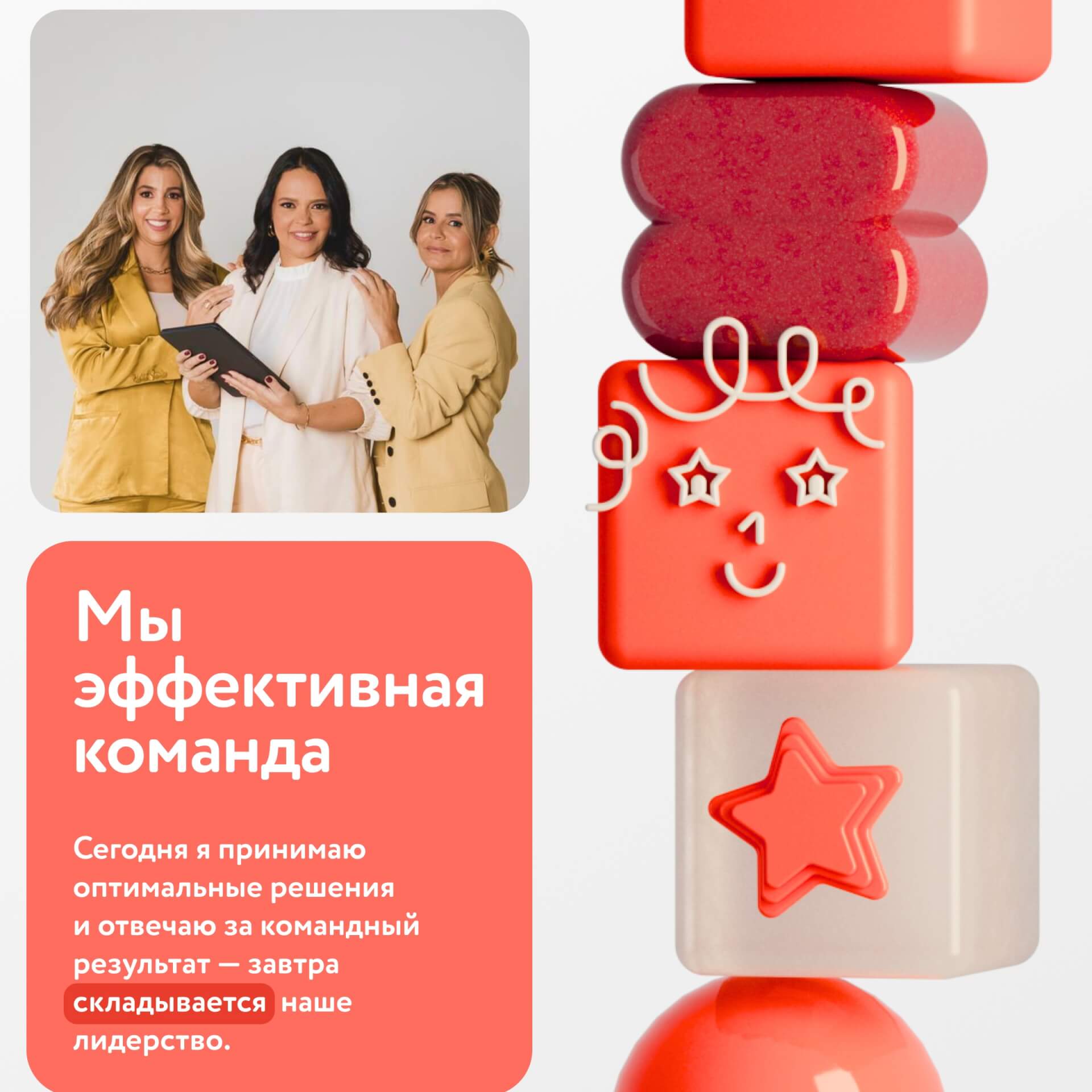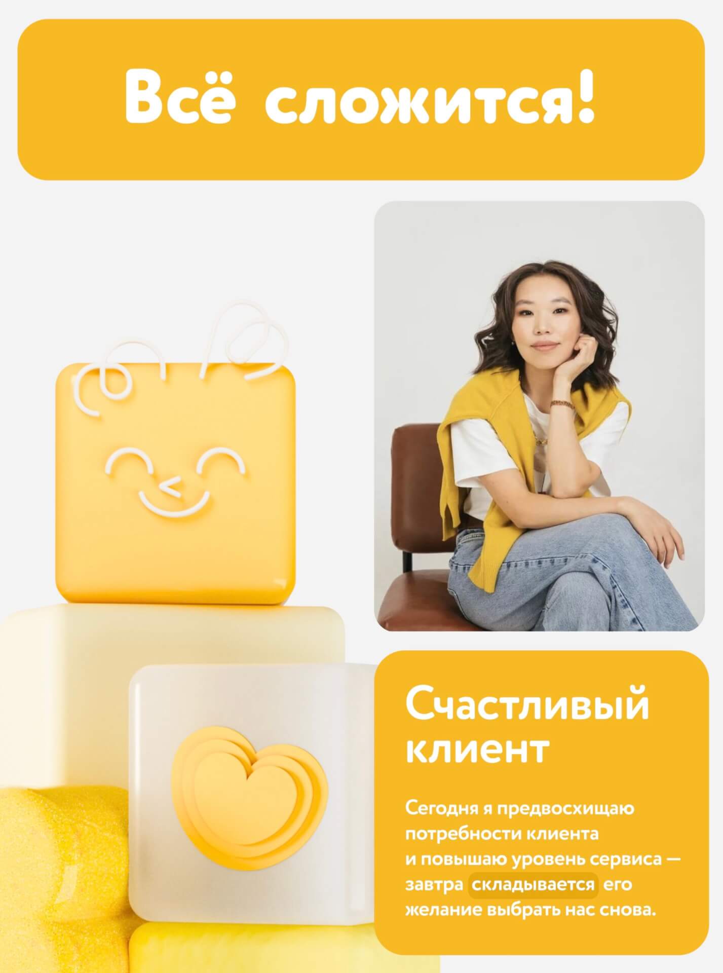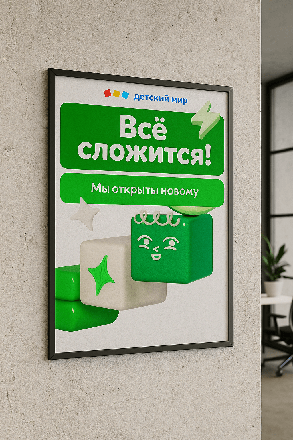 Новые 4 ценности идеально «рифмовались» с 4 кубиками на логотипе. Совпадение? Нет, знак судьбы. Теперь каждый кубик символизирует один из корпоративных принципов. И когда они складываются вместе, то у сотрудников тоже всё складывается. Идея понятна и откликается всем сегментам — и феечкам в торговых залах, и повелителям офиса, и сенсеям логистики. «Всё сложится» — слоган, который работает как аффирмация, заряжая сотрудников на светлые перемены.