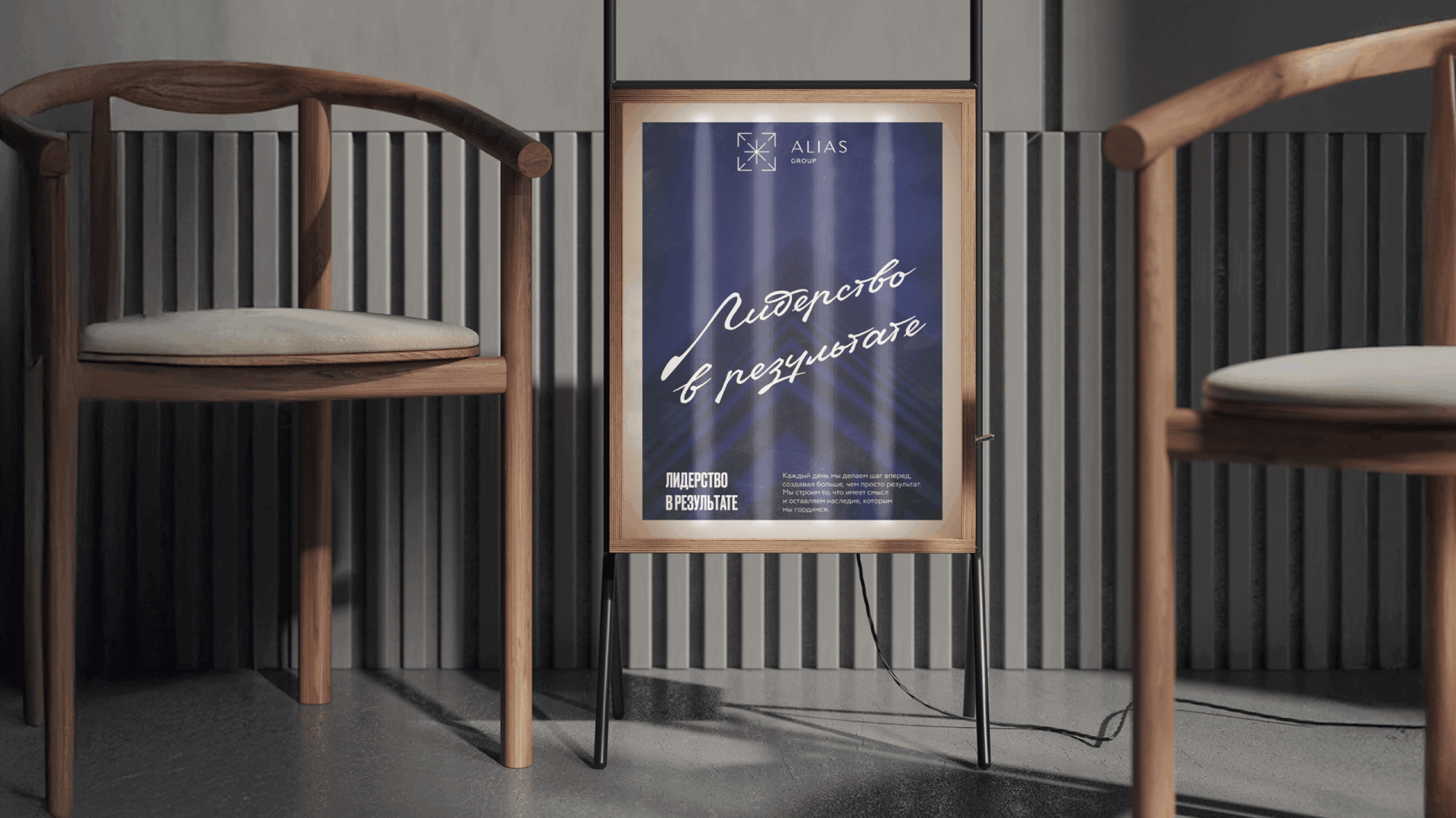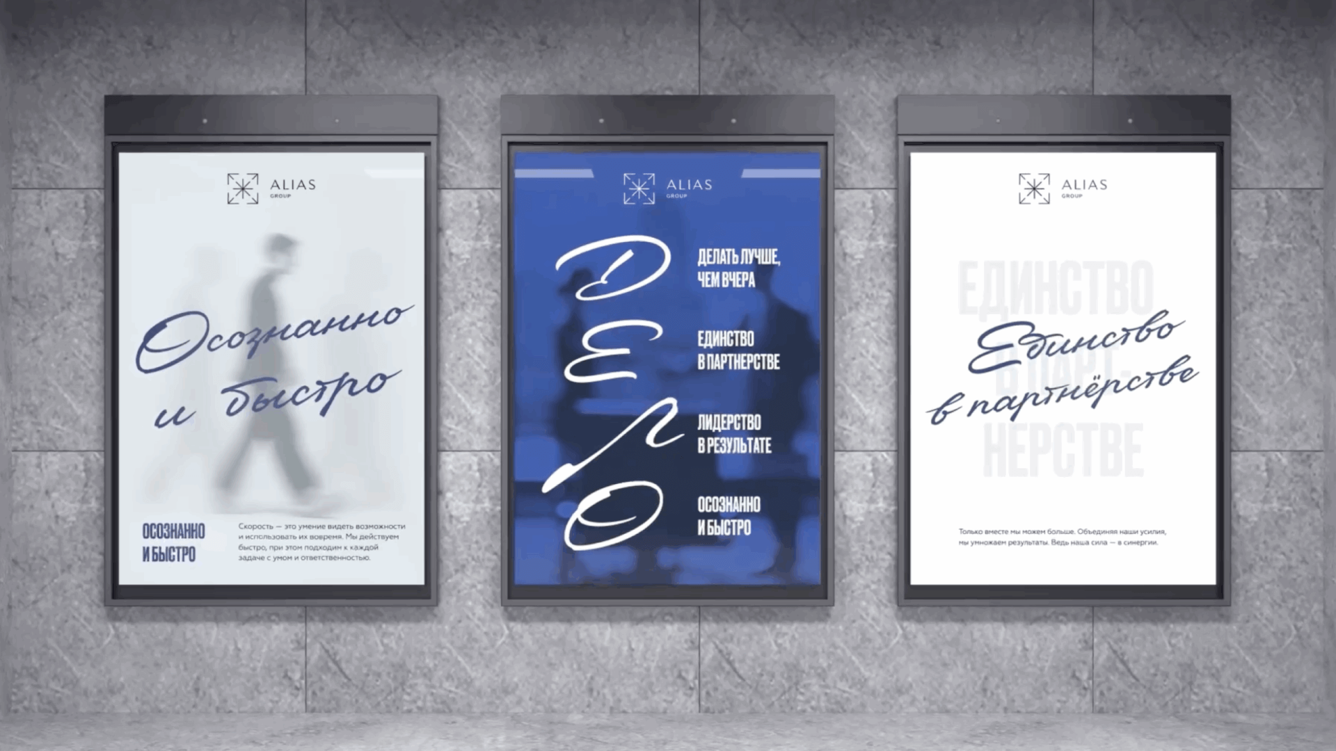 Во-первых, мы помогли Alias Group уточнить существующие принципы и придать им ясное, человечное звучание: «делать лучше, чем вчера», «единство в партнёрстве», «лидерство в результате», «осознанно и быстро». Первые буквы сложились в слово «ДЕЛО» — символ действия и общего направления. Так ценности обрели смысл и динамику, стали ориентиром для ежедневных решений и общения.