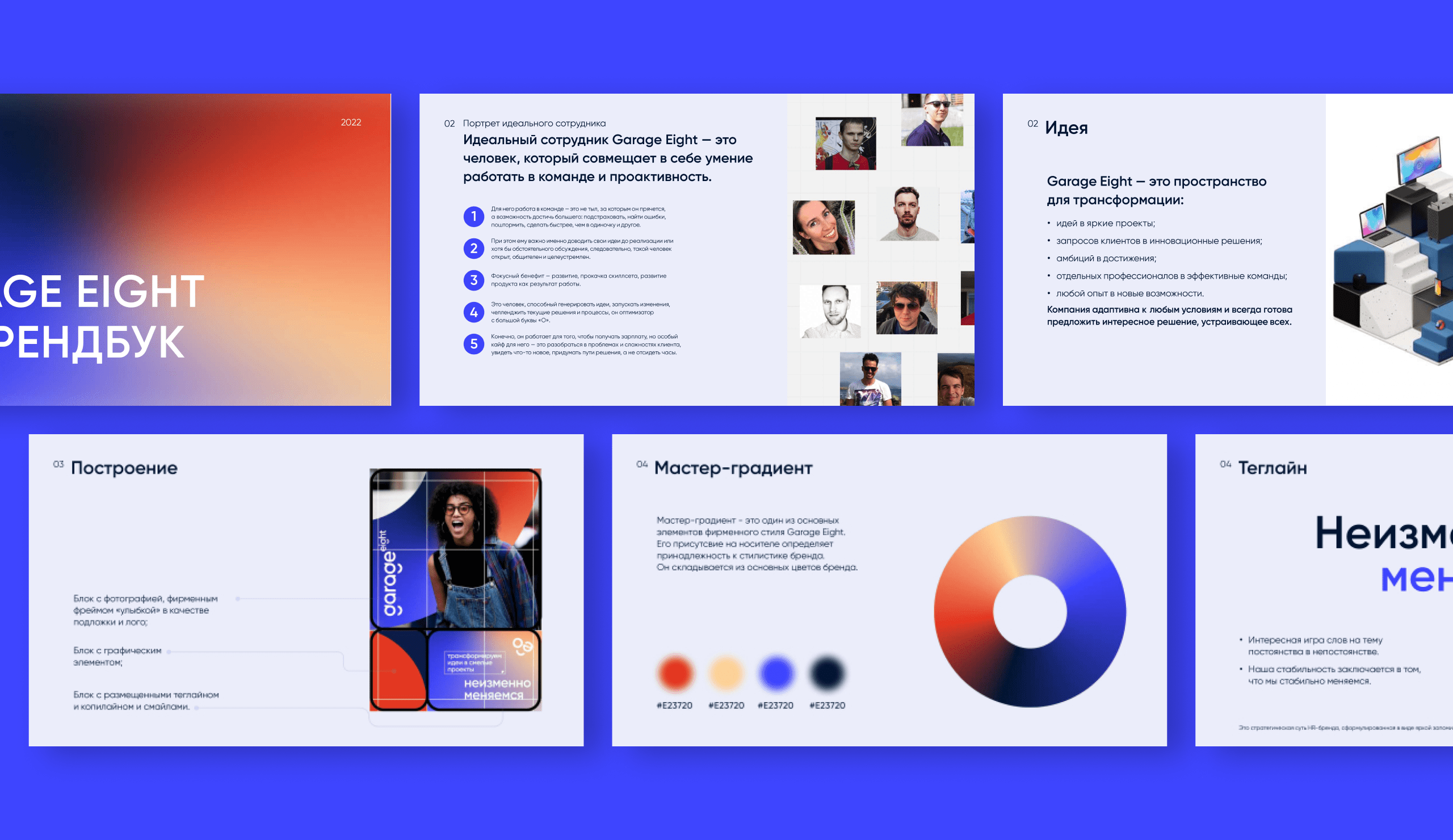Несмотря на изменчивость мира, garage eight не замирает, а адаптируется: развивает процессы, подходы, бизнес. Так родился слоган «Неизменно меняемся» — тонкая игра слов на тему стабильности в нестабильности.