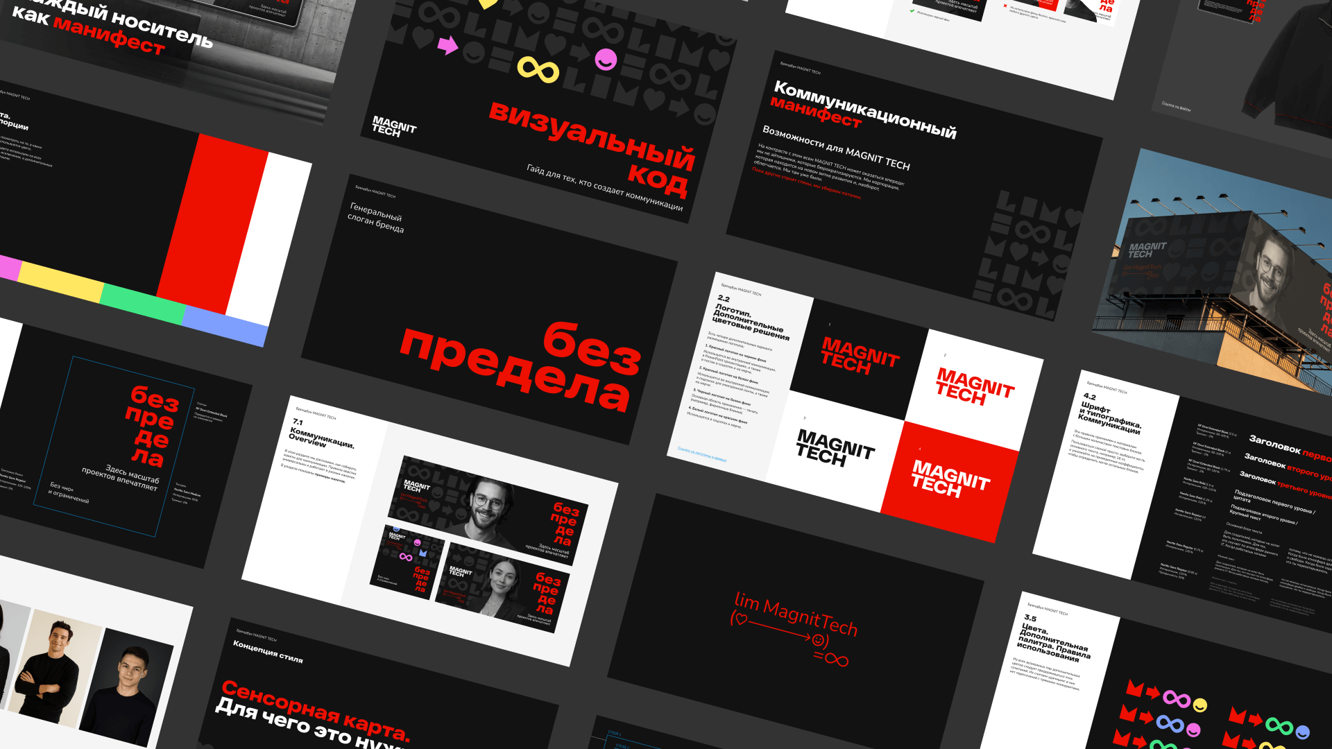 Создана айдентика с динамичной асимметрией, паттерном, основанным на форме предела, и палитрой, где красный «Магнита» сочетается с акцентными оттенками. Фотостиль с широкоугольной съёмкой создаёт эффект погружения, а мерч становится частью личного опыта сотрудников. Внедрена сенсорная карта — система звуковых, тактильных и обонятельных ориентиров. Брендбук разделили на два понятных гайда: стратегический и визуальный. Оформление — живой сторителлинг без формализма.