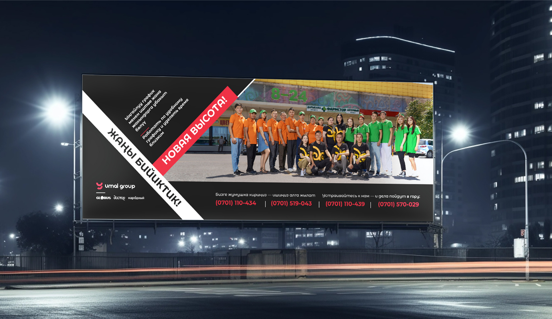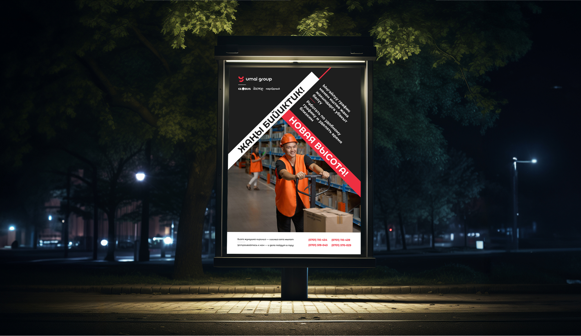 Для креативной концепции мы использовали привычную и близкую жителям Кыргызстана метафору гор. Устроиться в Umai Group — это как попасть на вершину вершин среди компаний. Тут тебе и масштаб, и перспективы, и сила, и сопричастность к чему-то большому. Слоган «Umai Group — новая высота!» в сочетании с поясняющими саблайнами рассказывает, каких высот может добиться человек в компании: в заработке, в отношении к себе, в задачах и т.д.