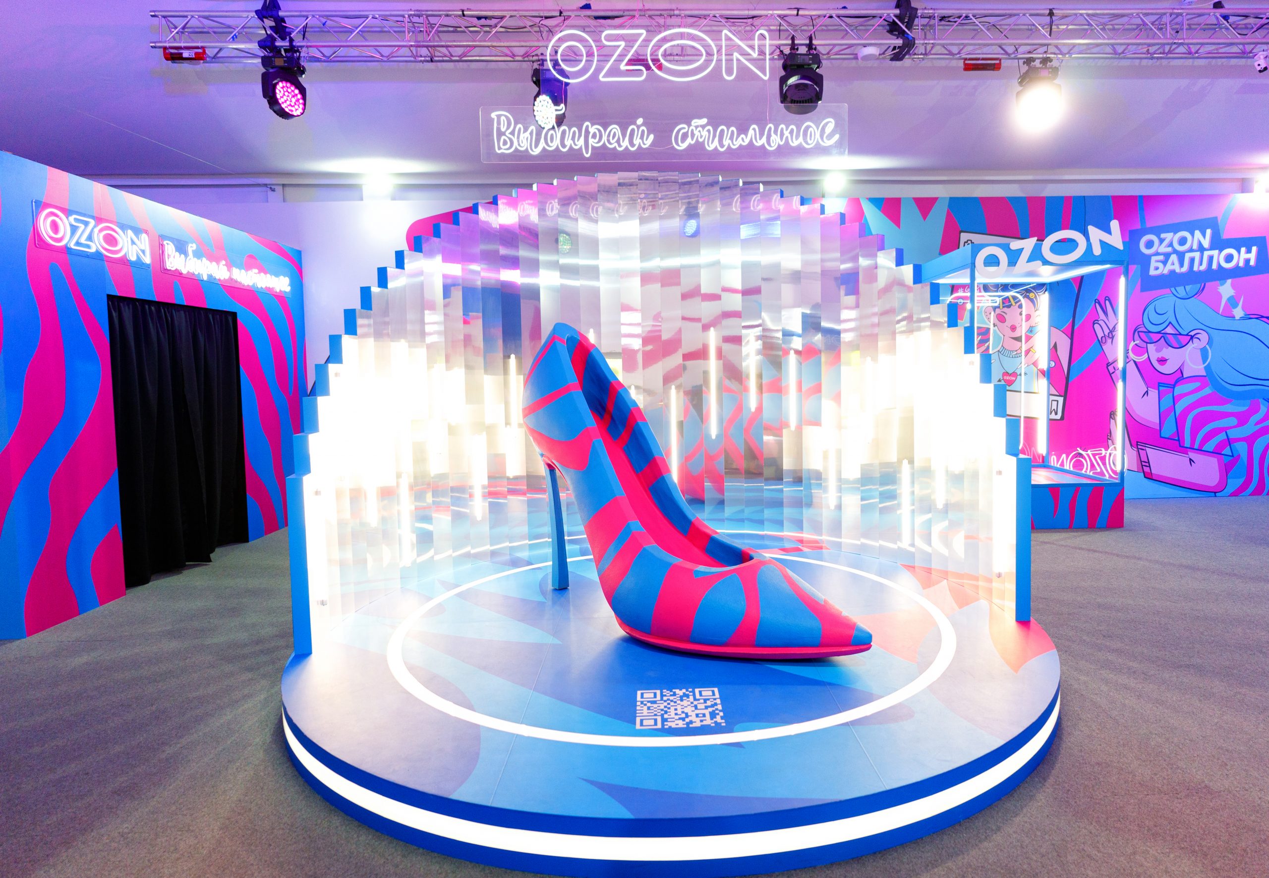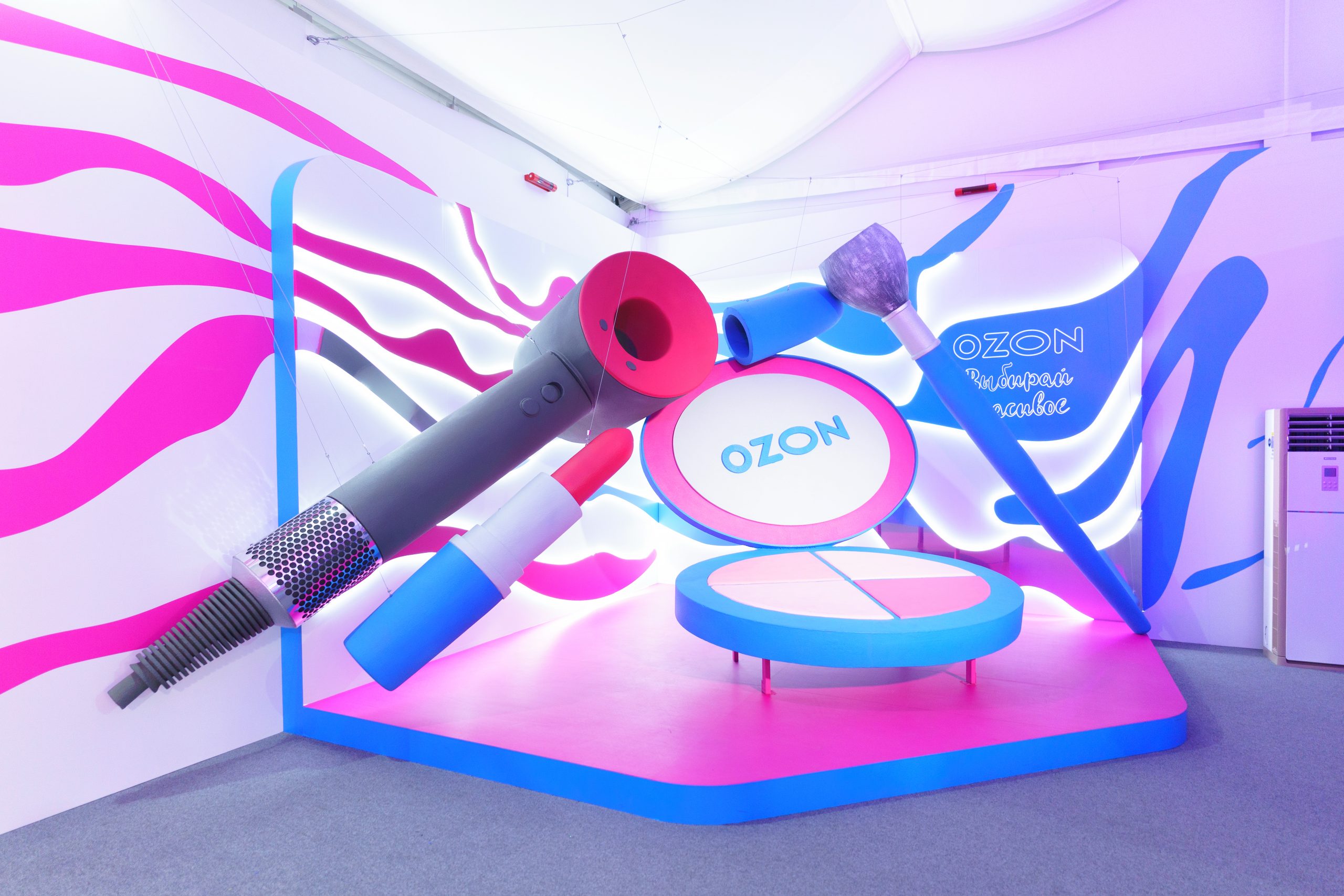 Внутри павильон делился на две зоны. Первая—это масштабированные арт-объекты—фен, помада, туфля и др.—для создания крутых фото и рилсов. Каждый арт-объект раскрывал одну из категорий Ozon: Beauty, Fashion, Молодёжь, Для мам.